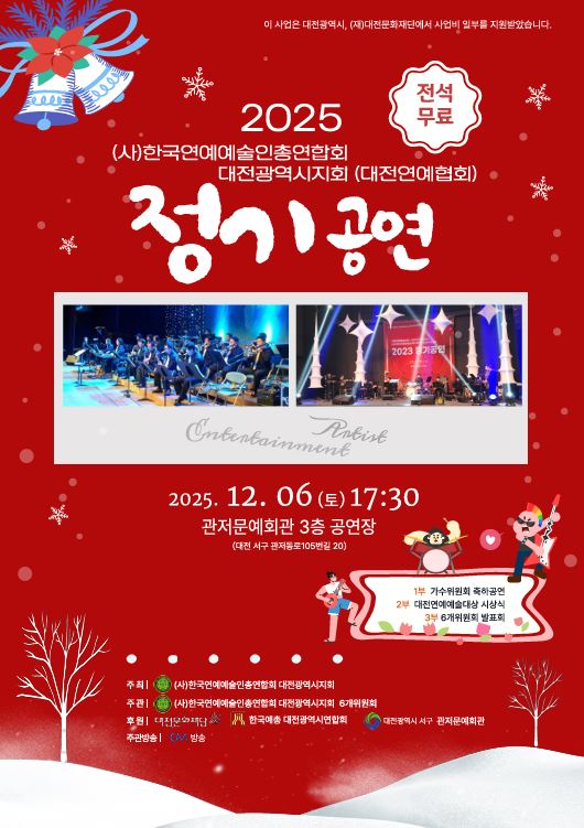 (»ç)Çѱ¹¿¬¿¹¿¹¼úÀÎÃÑ¿¬ÇÕȸ ´ëÀü±¤¿ª½ÃÁöȸ(ÁöȸÀå ÁÖÁ¤°ü)°¡ ÇÑ ÇØ¸¦ ¸¶¹«¸®Çϸç Áö¿ª ¿¬¿¹¿¹¼úÀÎÀÇ Ã¢ÀÛ È°µ¿À» Á¶¸íÇÏ´Â ‘2025 Á¤±â°ø¿¬’À» °³ÃÖÇÑ´Ù. À̹ø °ø¿¬Àº ´ëÀü¹®ÈÀç´Ü Áö¿ø»ç¾÷À¸·Î ¸¶·ÃµÆÀ¸¸ç, ½Ã¹Î°ú ¿¹¼úÀÎÀÌ ÇÔ²²ÇÏ´Â ¹®ÈÃàÁ¦ÀÇ ÀåÀ¸·Î ²Ù¸çÁú ¿¹Á¤ÀÌ´Ù.