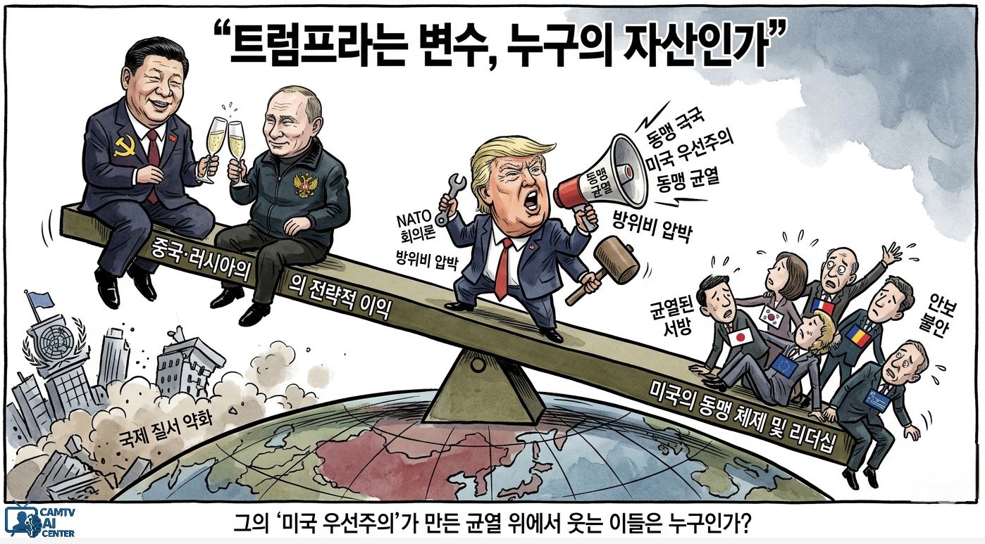 Æ®·³ÇÁÀÇ Á¤Ä¡Àû ¸Þ½ÃÁö´Â ÀϰüµÇ°Ô ‘¹Ì±¹ ¿ì¼±ÁÖÀÇ’¸¦ ³»¼¼¿î´Ù. ±×·¯³ª ±× °á°ú´Â ¿ª¼³ÀûÀ¸·Î ¹Ì±¹ÀÇ ÀüÅëÀû µ¿¸Í ±¸Á¶¸¦ Èçµå´Â ¹æÇâÀ¸·Î ³ªÅ¸³µ´Ù. NATO¸¦ ÇâÇÑ È¸ÀÇÀû ¹ß¾ð, µ¿¸Í±¹ ¹æÀ§ºñ ¾Ð¹Ú, ±¹Á¦±â±¸ °æ½Ã ŵµ´Â ¹Ì±¹ Áß½ÉÀÇ Áú¼¸¦ ¾àȽÃŰ´Â °á°ú¸¦ ³º¾Ò´Ù. ÀÌ´Â °ð Áß±¹°ú ·¯½Ã¾Æ°¡ °¡Àå ¹Ù¶ó´ø Àü·«Àû ȯ°æ, Áï ‘±Õ¿µÈ ¼¹æ’°ú ‘ºÐ¿µÈ µ¿¸Í’ÀÇ Çö½ÇÈ´Ù.